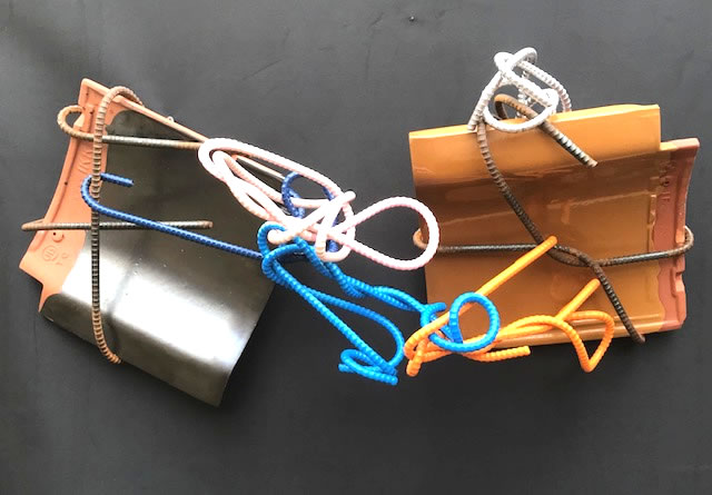 瓦を使ったオブジェは内山寿峰先生の作品です。瓦職人、華道家、造形作家と多方面に才能を発揮して居るアーティストです。 作品は鉄筋と瓦を用い華道家のセンスでフィリングを大切に制作しています。エネルギッシュな作家の溢れるパワーと凝縮して居る秀作です。