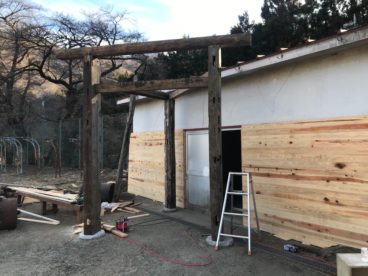 中の天井や梁をペンキで塗り終わり次は入り口のオブジェを造りました。