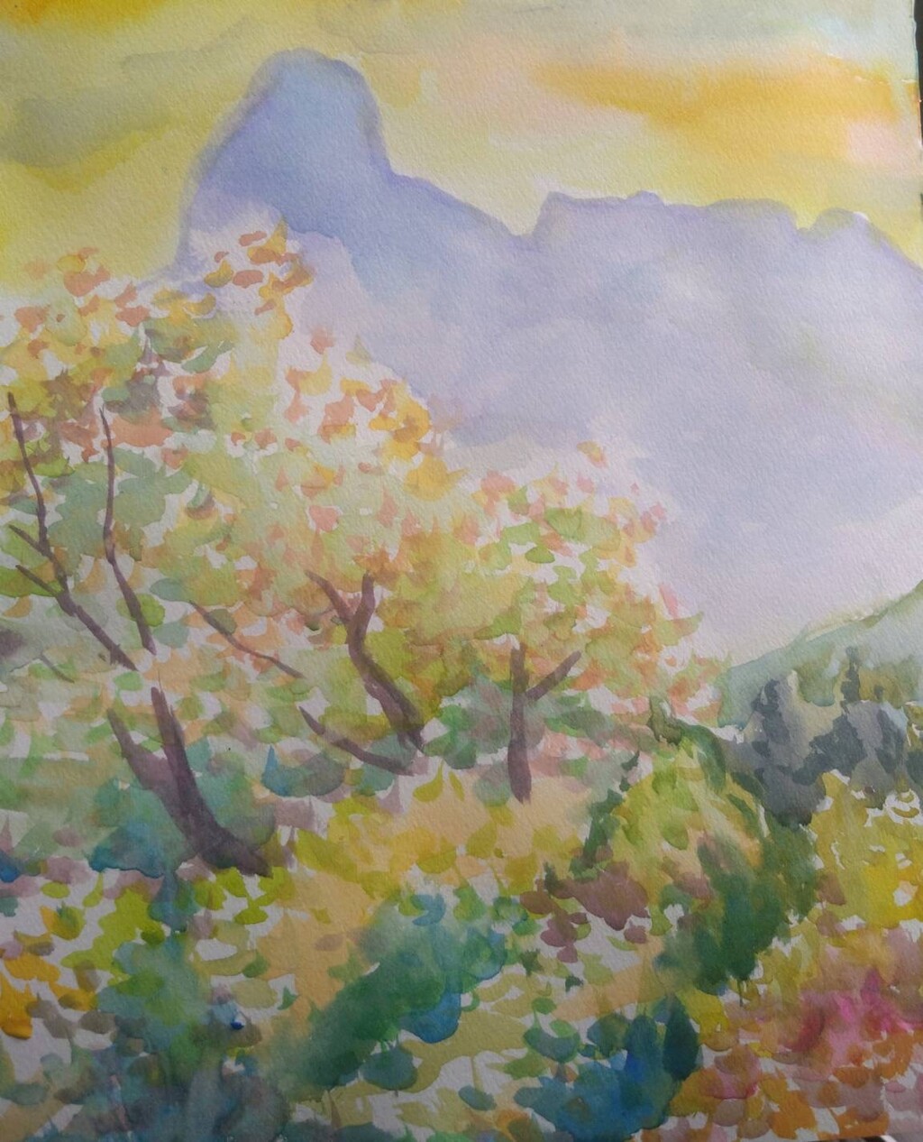 高い山々はその頃紅葉が始まっていて美しい風景を求め車を走らせて制作したものです。